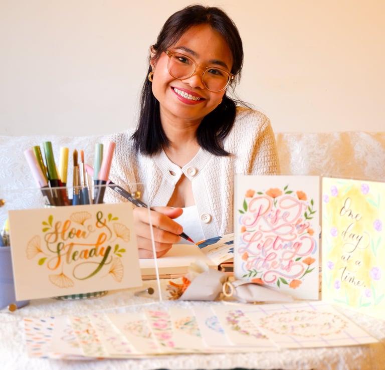 Having worked in the healthcare industry, she revisited her creativity in times of burnout and led her to calligraphy. It became her form of self-care, a way of finding magic in the mundane. She mainly writes inspiring quotes with floral illustrations and shares them on social media. Her cat, Misty, sometimes makes a special appearance, appreciating the calm nature of calligraphy.