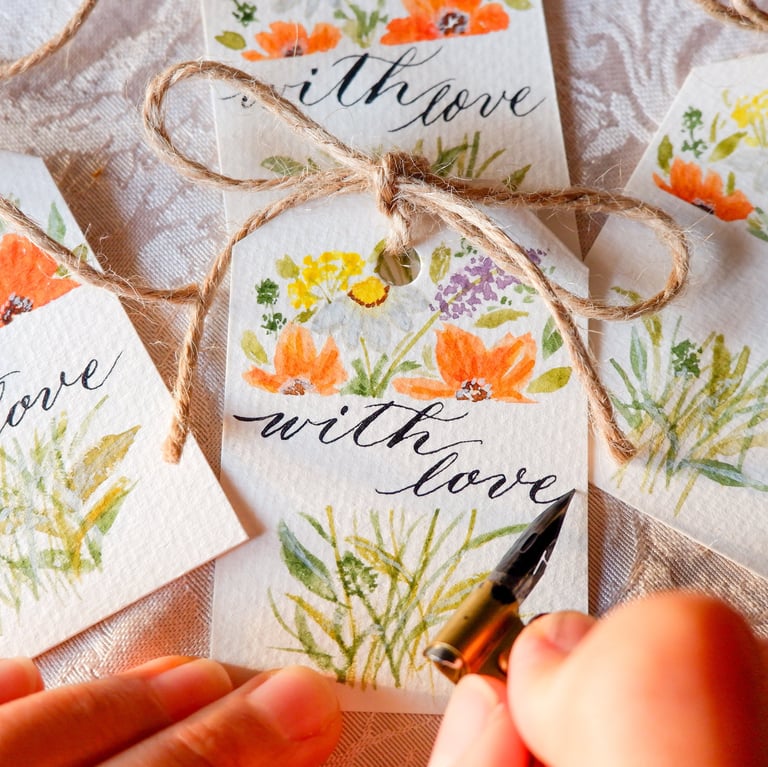 As an experienced NYC calligrapher, I offer live watercolor illustration in NYC as an add-on to calligraphy services, pairing hand-lettered names with custom-painted florals and motifs. Each piece is created on-site, transforming simple personalization into a beautifully composed work of art.